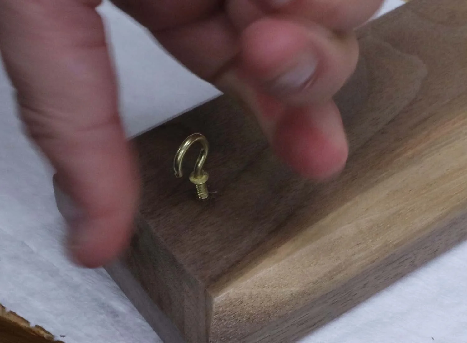 On the underside of the top piece, make a mark 1" (25 mm) in from the end and centered on the board. Pre-drill with a bit slightly smaller than the screw end of the 5/8" (16 mm) screw cup hook, and then screw this hook in. You may have to use a screwdriver to increase your leverage when screwing this in.